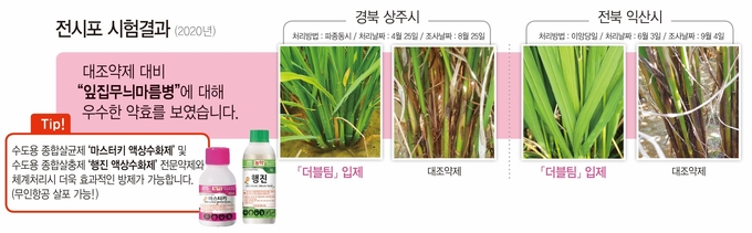 특히, 작물에 대한 안전성이 뛰어나 파종 동시 처리는 물론, 이앙 당일까지도 사용이 가능해 현장 활용성이 높다. 육묘상에서 1회 처리만으로 세균벼알마름병, 잎집무늬마름병, 깨씨무늬병, 키다리병 등 주요 병해는 물론, 벼물바구미, 먹노린재, 벼멸구 등 주요 해충까지 동시에 방제할 수 있어 효율적인 초기 통합 방제가 가능하다.