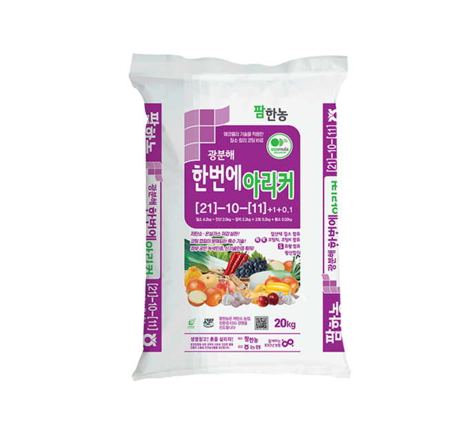 ‘광분해 한번에아리커’는 관행 시비 대비 노동력을 줄이면서도 수확량 증대가 가능한 원예용 완효성 비료다. ‘광분해 한번에아리커’가 함유한 질산태 질소는 정식 초기 빠른 활착과 생육을 돕고, 완효성 비료 성분은 생육 후기까지 꾸준히 양분을 공급해 웃거름 시비를 줄여준다. 웃거름을 자주 주는 작물이나 저온기 정식 작물, 멀칭재배에 사용 시 노동력과 영농비 절감 효과를 톡톡히 볼 수 있다. 친환경 분해 과학 ‘에코뮬라’ 기술을 적용해 완효성 비료의 코팅 껍질 잔류 문제를 개선했으며, 토양 및 수질 오염 문제를 줄일 수 있다.