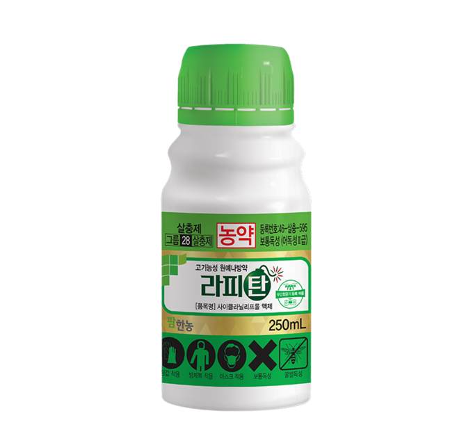 ‘라피탄’은 나방, 총채벌레, 가루이 등 채소 주요 해충을 동시에 방제하는 디아마이드계 살충제다. 나방 유충의 근육을 수축시켜 활성이 빠르고 확실하며, 침투이행성과 침달성도 우수해 약액이 직접 닿지 않은 부위까지 약효 성분이 이동해 방제 효과를 발휘한다. 지속력이 뛰어나 나방 밀도 관리에 효과적이다. 알 부화 억제, 유충 방제(섭식독), 성충 산란 억제(접촉독) 작용으로 다음 세대 나방 발생을 체계적으로 억제한다. 강우 등 날씨에 관계 없이 안정적으로 방제할 수 있고, 무인항공기 살포에도 최적화된 제품이다.