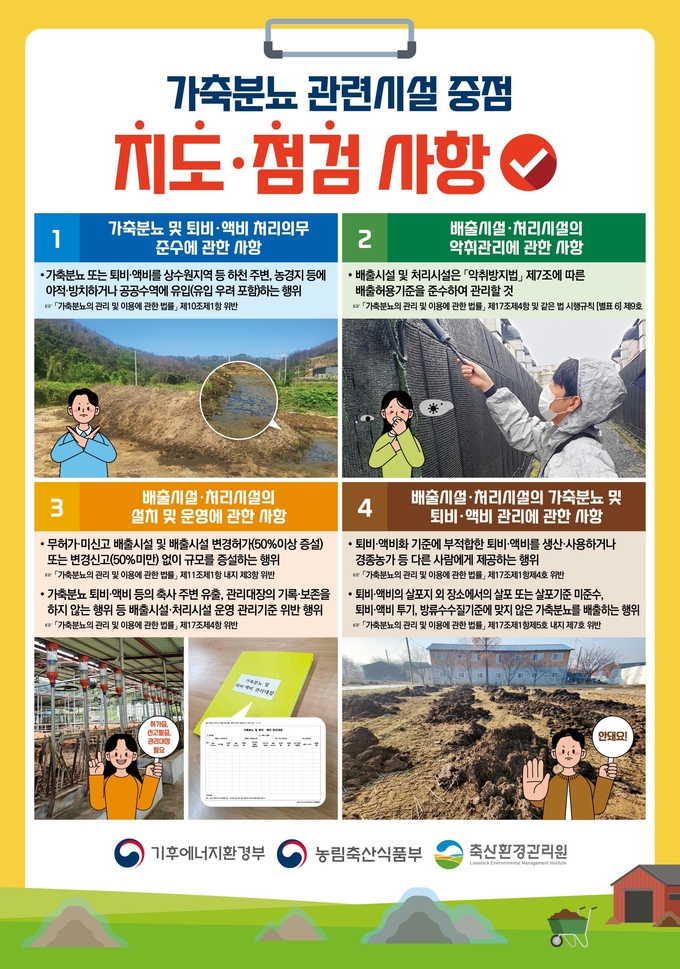이번 지도·점검에서는 수질오염·악취 민원 다발 지역, 공공수역 인접 시설, 지방정부 간 경계지역 시설, 최근 2년 내 가축분뇨법령 위반 시설 등 환경오염 우려가 높은 시설에 대해 가축분뇨법령 준수 여부를 중점적으로 점검한다.