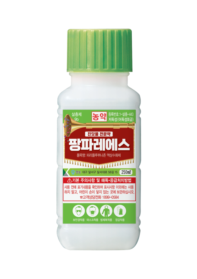 정식 이후 진딧물 방제에는 ‘팡파레에스’를 활용할 수 있다. 팡파레에스는 피리플루퀴나존 성분의 IBR계 살충제로, 해충의 행동을 저해해 작물 부착과 섭식을 억제하는 방식으로 작용한다. 진딧물이 잎에 남지 않을 정도로 빠르게 흡즙 행동을 멈추게 하며, 기존 약제에 저항성이 생긴 진딧물에도 우수한 효과를 보인다. 또한 약효 지속기간이 길어 정식 이후 진딧물 발생이 본격화되는 시기에 효율적인 방제가 가능하다.
