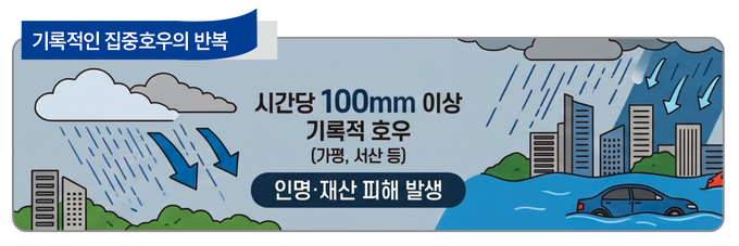 국지성 집중호우로 도심 침수, 도로, 교통 기반시설, 산사태 등의 피해가 발생했으며, 총 25명(사망 24명, 실종 1명)의 인명피해와 총 1조 1,307억 원의 재산피해(최근 5년 평균의 1.8배)가 발생했다. 특히, 7월 17일 광주광역시에는 426.4mm의 기록적인 호우로 도로 침수 및 지하철 운행 중단 등의 피해가 발생했다. 정부는 향후 인공지능(AI) 홍수예측 정확도를 개선하고 홍수에 취약한 하천의 실시간 감시를 위해 수위관측소 및 ‘스마트 유량관측시설’ 확대 등 홍수피해를 줄이기 위한 기반 시설을 개선할 계획이다.