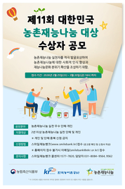 농림축산식품부(장관 송미령)와 한국농어촌공사(사장 김인중)가 농촌 지역사회 발전에 기여한 숨은 공로자들을 찾아 격려하기 위해 ‘제11회 대한민국 농촌재능나눔 대상’ 수상 후보자를 공모한다고 밝혔다. <공모 주요 내용> □ (공모기간) 2026. 2. 25(수) ∼ 2026. 3. 20(금) □ (참여대상) 2년 이상 농촌지역 재능나눔 실천 단체 및 개인 □ (포상규모) 정부포상(대통령, 국무총리), 농정포상(농식품부 장관), 국회포상(농해수위 국회의원), 사장포상(공사) 총 16점 □ (신청방법) 스마일재능뱅크(www.smilebank.kr) □ (시 상 식) 2026. 11월(예정) 이번 포상은 대통령 표창, 국무총리 표창 등 정부포상을 비롯해 농식품부 장관(농정포상), 농해수위 국회의원(국회포상), 한국농어촌공사 사장(공사포상) 등 총 16점 규모로 수여된다. 농촌재능나눔 분야에서 꾸준히 헌신한 개인 또는 단체가 신청할 수 있으며, 포상 훈격에 따라 요구되는 활동 실적 기간이 다르다. 구체적으로는 ▲정부포상 5년 이상 ▲농정 및 국회포상 3년 이상 ▲공사포상 2년 이상의 공적을 쌓아야 한다. 응