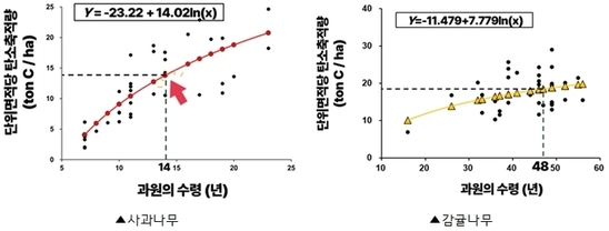 농촌진흥청(청장 이승돈)은 국민대학교, 서울시립대학교와 공동으로 사과, 감귤나무의 탄소흡수 계수를 국내 최초로 개발하고, 이를 국가 온실가스 배출·흡수 계수로 최종 등록했다고 밝혔다. 이번 성과는 농경지 부문에서 ‘기후변화에 관한 정부 간 협의체(IPCC)’가 권고하는 정밀한(Tier 2 수준) 온실가스 배출량 및 흡수량 목록(인벤토리) 산정 체계를 구축했다는 점에서 의미가 크다. Tier 2 수준은 IPCC 온실가스 지침에서 제시하는 단계적(tier) 방법 중 중간 단계로 Tier 1이 전 세계 공통 기본값(기본 계수)을 사용하는 ‘대략적 추정’ 수준이라면, Tier 2는 자국의 기후·토양·품종·재배관리 등 특성을 반영한 계수를 적용함으로써 불확실성을 줄이고, 보다 정확한 국가 온실가스 배출·흡수량을 추정할 수 있는 정밀한 수준의 방법이다. 그간 우리나라는 온실가스 배출량 및 흡수량 목록 산정 시, 산림지 임목만 포함했다. 농경지 중 과수·과수원은 토양 탄소만 반영하고, 과수의 바이오매스는 제외됐다. 이런 이유로, 과일나무가 흡수하는 탄소량은 관련 계수가 없어 정확한 측정‧평가가 어려웠다. 연구진은 국가 대표성을 확보하기 위해 온대와 아열대 대표 과일이자,