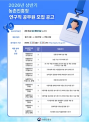 농촌진흥청(청장 이승돈)이 2026년도 연구직 공무원 20명을 경력경쟁채용시험을 통해 선발한다. 올해에는 인공지능(AI) 기반 육종 모델링, 기후변화 대응, 농작업자 안전 등 전문가 채용에 중점을 두고 농업환경, 작물보호, 생명 유전, 작물, 원예 5개 직류에서 총 20명을 선발한다. 18세 이상(2008년 12월 31일 이전 출생) 관련 전공 석사 학위 이상 소지자면 누구나 응시할 수 있다. 오는 4월 25일 객관식 필기시험(사지선다형, 직류별 전공 4과목)을 치른 후 합격자를 대상으로 서류전형과 심층 면접을 거쳐 최종 합격자를 선발한다. 응시원서는 온라인 접수만 가능하고, 2월 20일부터 25일까지 농촌진흥청 온라인 원서 접수 시스템을 통해 접수한다. 자세한 내용은 농촌진흥청 누리집에서 확인하거나, 농촌진흥청 운영지원과로 문의하면 된다. 농촌진흥청 김정현 운영지원과장은 “인공지능(AI)과 빅데이터를 활용, 디지털 농업 시대를 앞당기고 기후 위기 속에서 식량 안보를 책임질 핵심 인재 확보에 중점을 두고 있다.”라며, “미래 농업을 선도할 유능한 인재들의 많은 지원을 바란다.”라고 말했다.