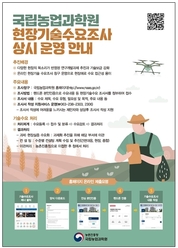 농촌진흥청(청장 이승돈) 국립농업과학원은 농업 현장에서 겪는 기술적 어려움을 찾고 이를 신속히 해결하고자 기술수요를 상시 접수하고 맞춤형 기술지원을 추진한다. ▶기술수요: 국립농업과학원 관련 현장에서 요구되는 연구개발과 기술 보급에 필요한 기술수요(국립농업과학원 훈령 제254호) 대한민국 국민이라면 누구나 접수할 수 있고, 연중 신청받는다. 신청은 ‘국립농업과학원 누리집(naas.go.kr) 접속→ ‘현장기술수요’ 배너광고 클릭→ 본인인증→ 양식 작성 후 제출’하면 된다. 국립농업과학원은 조사서 작성에 어려움을 느끼는 제안자를 위해 현장기술수요 조사서 작성 지원 서비스도 운영 중이다. 전문가 도움이 필요한 제안자가 전화로 문의하면, 전문가 상담 후 조사서 작성을 지원한다. 이렇게 제출한 기술수요는 국립농업과학원 기술수요검토위원회를 거쳐 ▲연구과제 ▲현장실증과제 ▲전문가‧현장 상담 ▲관련 기관 이관 등으로 분류된다. 이후 연구개발과 현장 적용을 체계적으로 지원하는 기초 자료로 쓰일 예정이다. 국립농업과학원은 현장기술수요조사 상시 운영이 농업 현장의 문제를 신속하게 파악하고 필요한 기술을 제때 제공함으로써 농업인 불편은 줄이고 생산성과 효율성을 높이는 데 이바지