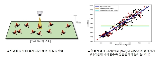 이번에 개발한 ‘육계 체중 예측 기술’은 카메라 영상으로 관측한 육계의 크기(면적, pixel)에 대한 정보를 활용해 계군의 평균 체중을 예측할 수 있도록 했다.