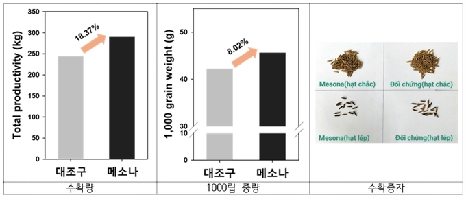 파종 후 생육기 동안 총 4회에 걸쳐 500㎡당 500ml씩 처리한 결과, 메소나를 처리한 벼(290kg)는 전통 방식으로 재배한 대조구(245kg)보다 약 18.4% 높은 수확량을 보였다. 충실한 쌀 비율은 70.6%, 1,000립 무게는 45.64g으로 대조구(각 66.2%, 42.25g)보다 품질 지표도 높았다.