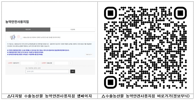 농업기술포털 ‘농사로 > 관심콘텐츠 > 수출농산물 농약안전사용지침’ 또는 정보무늬(큐알코드)로 접속할 수 있다.
