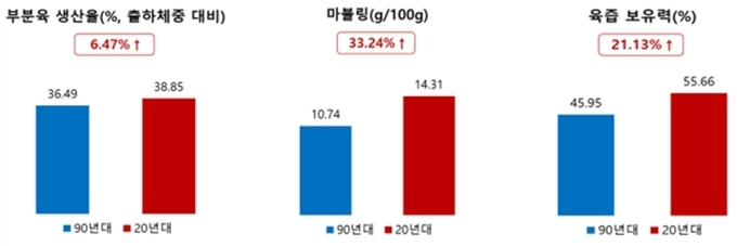 한우의 도체 특성 변화도 뚜렷하다. 실제 먹을 수 있는 살코기 비율(정육률)은 36.4%에서 38.8%로 상승했다. 등심의 지방 함량(마블링)은 100g당 10.7g에서 14.3g으로 33.6% 이상 증가했다.