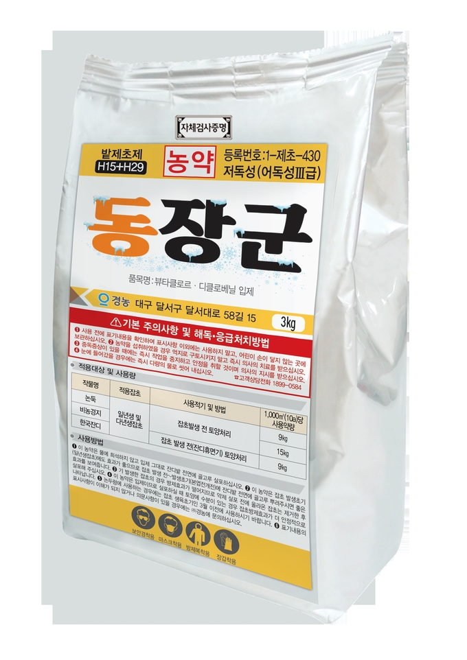 경농 제품개발팀은 “동장군 입제는 잡초 발아억제 효과가 우수하고 토양흡착력이 강해 약효 지속성이 길기 때문에 노동력과 비용을 효과적으로 줄일 수 있는 제품”이라며 “토양에 수분이 있을 때 살포하면 약제 처리층이 형성돼 이듬해 봄철까지 잡초를 안정적으로 관리할 수 있다”고 말했다.