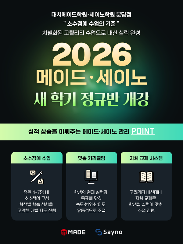 이에 따라 메이드학원·세이노학원의 1학기 정규반은 6~7명 정원 소수정예 수업으로 운영된다. 4시간 동안 담임 교사가 직접 개념 설명부터 문제풀이, 질의응답, 약점 분석까지 밀착 지도하는 것이 특징이다. 대형 강의식 수업과 달리 학생 개개인의 이해도를 실시간으로 점검하고, 틀린 문제의 원인을 바로잡아 학습 효율을 극대화하여 많은 추천을 받고 있다.