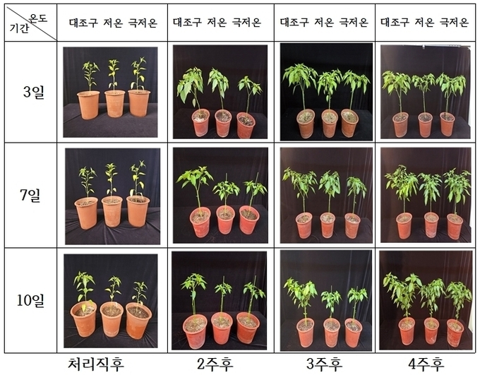 연구진은 고추 아주심기 후 2주 뒤부터 낮에는 15도(℃), 밤에는 10도(℃) 저온에 3~10일 노출하며 광합성 특성과 생육, 열매 달림, 수확량 변화를 조사했다. 실험에는 붉은 고추 수확용으로 널리 재배되는 품종을 활용했다.