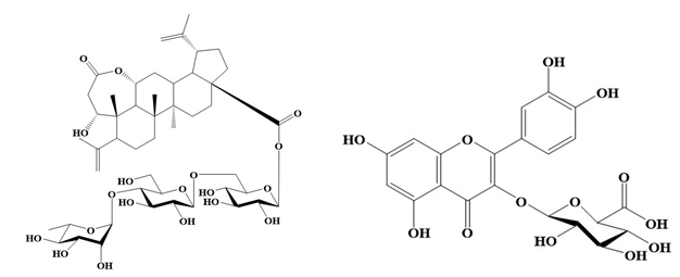 ▲국산 오가피 순에 함유된 주요 사포닌(좌, chiisanoside) 및 플라보노이드(우, quercetin 3-O-glucuronide)