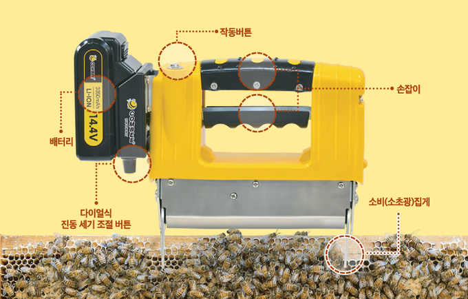 특히 강한 진동을 이용해 소초광에 붙어있는 꿀벌을 순식간에 털어냄으로써 작업 중 벌의 폐사율을 낮추는 구조로 설계된 점도 특징이다. 탈봉 효율은 80% 이상으로 기존 제품 대비 성능 우위를 확보해 작업 시간 단축과 생산성 향상에 기여하고 있다.
