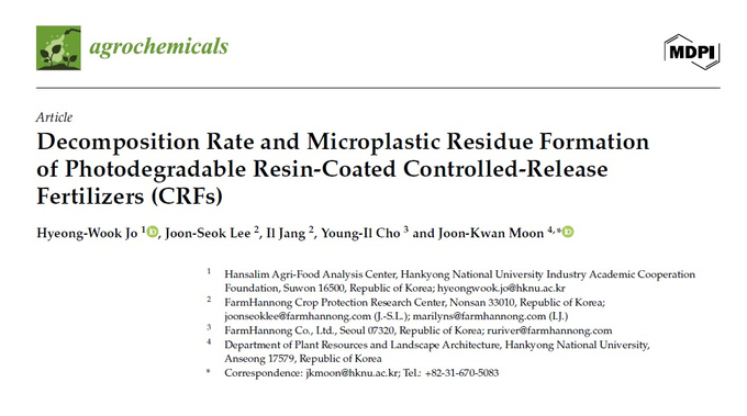 팜한농(대표 김무용)의 광분해 코팅 완효성 비료 기술에 관한 논문이 지난 15일 국제 학술지 아그로케미컬스(Agrochemicals)에 게재됐다. 아그로케미컬스는 국제 오픈 액세스 학술 출판사 엠디피아이(MDPI)가 발행하는 농화학 분야 전문 저널이다.