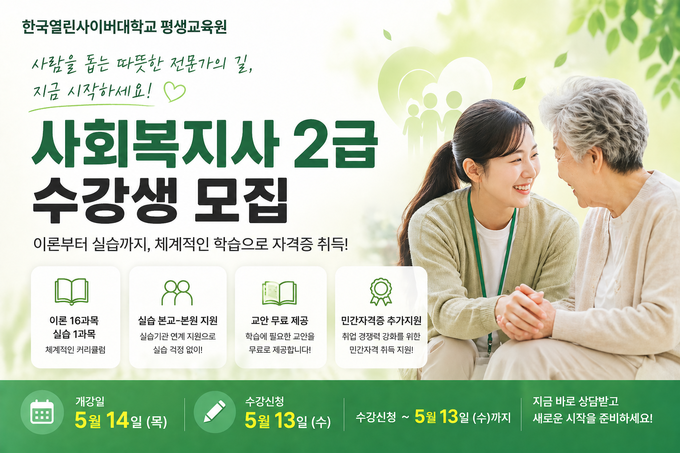 한국열린사이버대학교 평생교육원은 사회복지사 2급 자격증 과정 수강생을 5월 13일(수)까지 모집하고, 5월 14일(목) 개강한다고 밝혔다. 이번 개강반은 2026년 1학기 마지막 개강 일정으로, 이후 과정 참여를 원할 경우 다음 학기까지 기다려야 하는 상황이다.