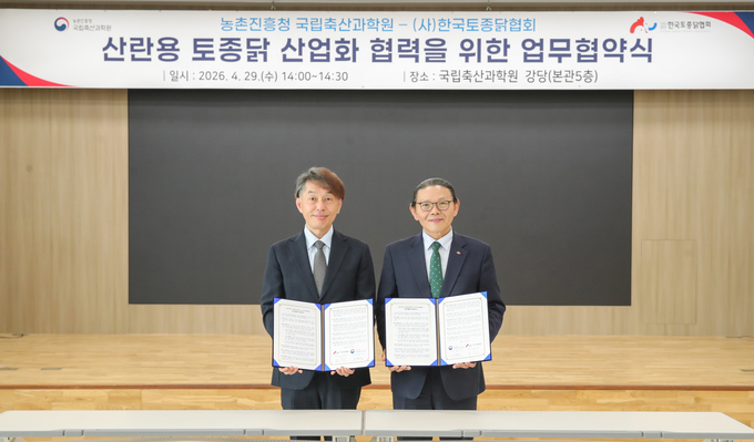 농촌진흥청(청장 이승돈) 국립축산과학원은 4월 29일 본원에서 ㈔한국토종닭협회(협회장 문정진)와 산란용 토종닭 개발과 보급 확대를 위한 업무협약을 체결했다.