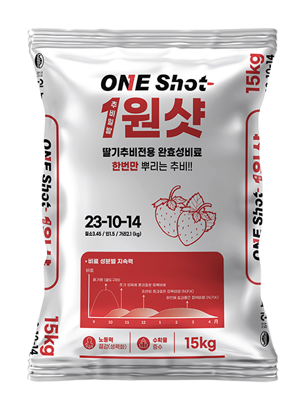 고기능성 완효성비료 ‘원샷’은 첨단 폴리우레탄 코팅 기술을 통해 비료 입자 하나하나를 감싸는 정밀 방출 설계를 적용해 각각의 비료 입자가 주기적인 방출 시간차를 두고 작물의 생육 시기에 맞춰 단계별로 필요한 성분을 최적의 비율로 방출한다. 이를 통해 초기 생장부터 수확기까지 안정적인 영양공급이 가능하며, 비료 손실을 최소화할 수 있기 때문에 비용 절감효과를 얻을 수 있다. 특히 작물의 생육 불균형을 방지하고, 작물의 품질과 생산성을 동시에 향상시킬 수 있다.