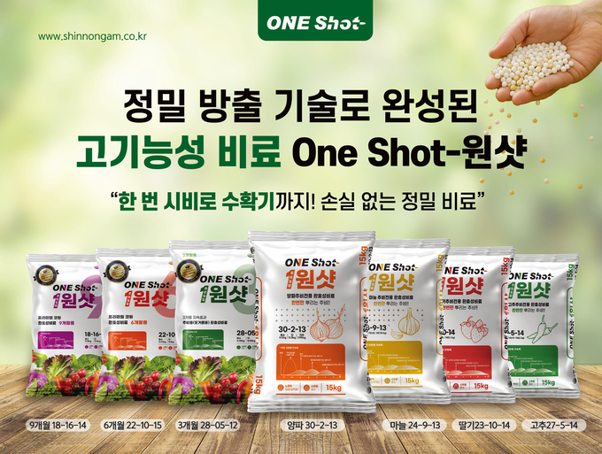 ㈜신농의 고기능성 코팅비료 ‘원샷’은 첨단 폴리우레탄 코팅 기술을 통해 비료 입자 하나하나를 감싸는 정밀 방출 설계를 적용해 각각의 비료 입자가 주기적인 방출 시간차를 두고 작물의 생육 시기에 맞춰 단계별로 필요한 성분을 최적의 비율로 방출한다. 이를 통해 초기 생장부터 수확기까지 안정적인 영양공급이 가능하며, 비료 손실을 최소화할 수 있기 때문에 비용 절감효과를 얻을 수 있다. 특히 작물의 생육 불균형을 방지하고, 작물의 품질과 생산성을 동시에 향상시킬 수 있다.