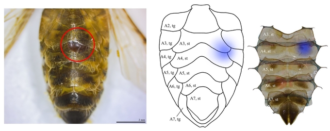 ▲2025년 2월 14일 월동 종료 전 꿀벌 복부 밀랍샘(Wax gland)에서 확인된 꿀벌응애 개체