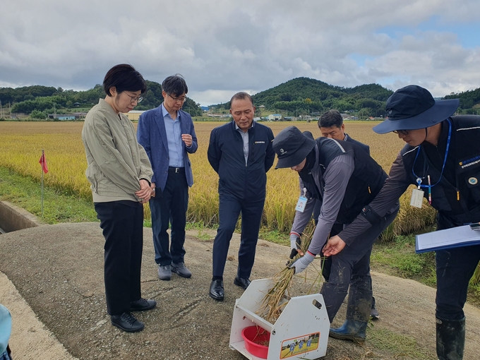 아울러 박수진 기획조정실장은 전남 함평군의 벼 깨씨무늬병 피해 현장을 방문하여 피해 상황을 살펴보았다. 올해 7~8월 이상고온과 9월 잦은 강우로 인해 전남, 충남 등에서 깨씨무늬병 피해가 약 36천ha에서 발생하였고, 농식품부는 10월 14일(화)에 깨씨무늬병을 농업재해로 인정하고 재해복구비를 지원하기로 밝힌 바 있다.