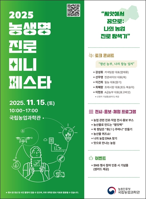 농촌진흥청(청장 이승돈)은 청소년들에게 농업의 가치와 다양성 체험 기회를 제공하고, 진로 탐색의 장을 마련하기 위해 11월 15일 농업과학관에서‘2025년 농생명 진로 미니 페스타’를 개최한다.