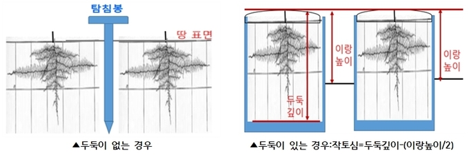 우선 토양을 경운하기 전 탐침봉으로 경운깊이를 측정해 경운깊이가 35~40cm 이상이 되는지 확인하고, 이보다 얕으면 깊게 경운한다.
