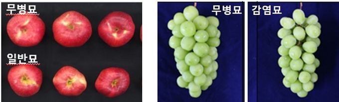 본 연구결과를 통해 국립종자원은 사과(후지챔피온, 시나노골드 등), 배(신고), 포도(MBA, 자옥), 복숭아(경봉, 신비 등) 4과종 12품종의 무병화에 성공했다. 이 중 6품종의 모수를 대량 생산 보급하여 무병묘를 식재한 농가를 추적조사한 결과, 사과 ‘홍로’는 생산량이 36.7%, 당도가 3°Brix 높아졌고 포도 ‘샤인머스켓’ 또한 당도가 약 1.22배 증가하는 등 품질 향상 효과가 확인되었다. 특히, 무병묘에서는 비상품과 비율이 50% 이상 크게 감소했고 재배 과정에서 바이러스 재감염도 발생하지 않았다.