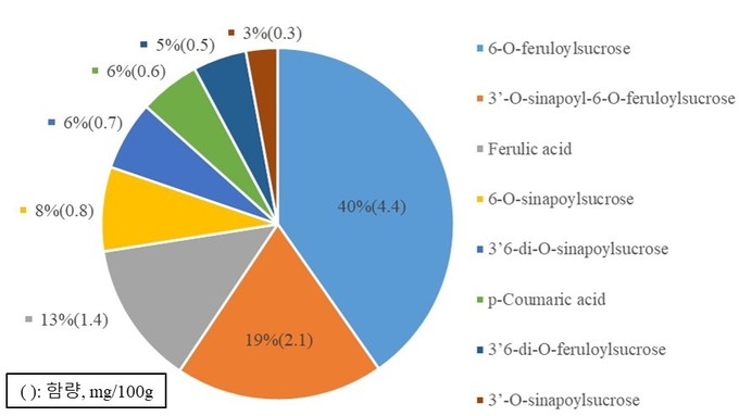 그 중 ‘6-O-페룰로일슈크로스(6-O-feruloylsucrose)’가 총 페놀산 함량의 약 40%(100g 당 생중량, 4.4mg)를 차지하는 가장 중요한 성분으로 확인됐다.