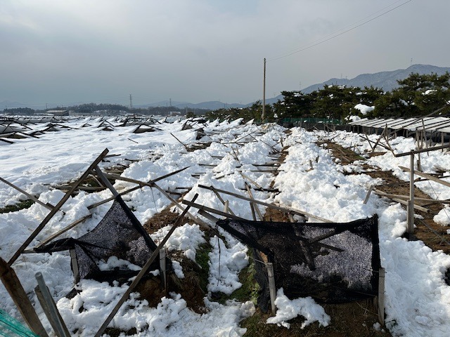 먼저, 갑작스러운 폭설이나 강풍에 대비해 인삼 해가림 시설의 지주목(지지대)과 결속 부분, 차광망 고정 상태 등을 점검하고, 약한 구조는 미리 보강, 버팀목을 설치한다.