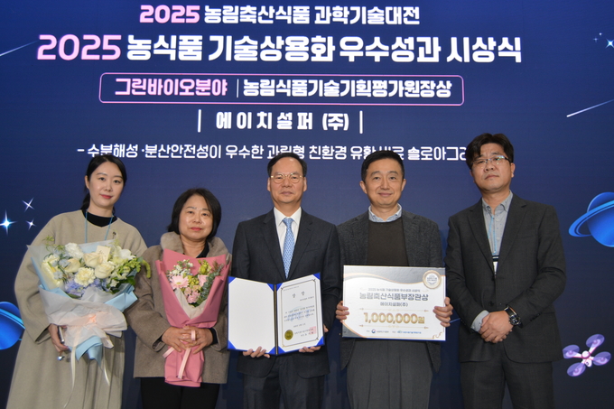 에이치설퍼㈜(대표이사 유선경)가 '2025 농림축산식품 과학기술대전'에서 농림식품기술기획평가원(원장 노수현. 이하 농기평)이 선정한 '2025 농식품 기술상용화 우수성과' 중 그린바이오 분야 농기평원장상을 수상했다. 이번 수상은 에이치설퍼가 지난 수년간 축적해 온 저탄소·친환경 비료 기술력이 국내에서도 공식적으로 인정받은 의미 있는 성과로 평가받고 있다.