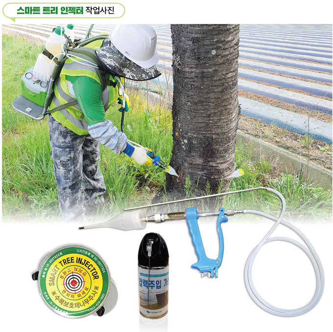 ‘스마트 트리 인젝터’는 약제가 용기에 담겨있는 기존의 수간주사와 달리 주입기를 이용하여 규격에 맞게 약제를 계량해 넣는 방식이다. 특히 수목의 특성과 계절적 요인을 감안하여 외부에서 주입가스를 사용, 압력을 가하는 새로운 개념의 혁신적인 제품이다.
