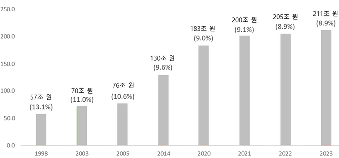 연도별 농식품산업 부가가치 규모 및 비중(GDP 대비) 추계