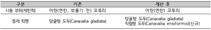 이에 따라 사용 부위가 기존 ‘어린(연한, 부풀기 전) 꼬투리’에서 ‘부풀기 전’이라는 조건을 삭제한 ‘어린(연한) 꼬투리’로 개선됐다. 또한, 신규 자원으로 ‘직립형 도두(Canavalia ensiformis)’를 추가 등재했다.