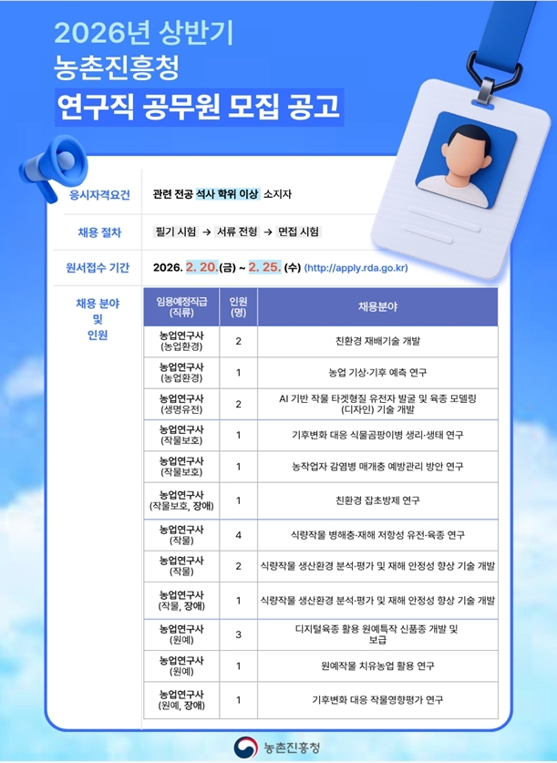 농촌진흥청(청장 이승돈)이 2026년도 연구직 공무원 20명을 경력경쟁채용시험을 통해 선발한다.