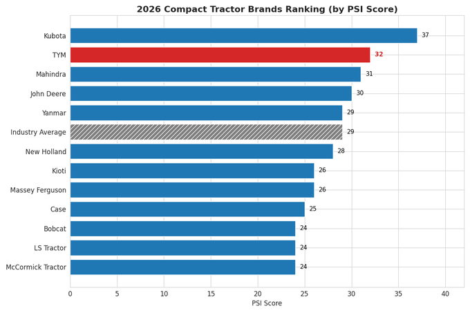 TYM은 미국 시장조사 기관 파이드 파이퍼(Pied Piper)가 발표한 ‘2026 파이드 파이퍼 PSI® 인터넷 리드 효율성(ILE®) 연구’에서 종합 점수 32점을 기록, 북미 진출 국내 농기계 브랜드 중 1위이자 종합 2위를 차지했다. 이번 연구는 총 772개의 트랙터 딜러를 대상으로, 웹사이트 문의에 대한 24시간 이내의 응대 속도와 품질을 평가하는 방식으로 진행됐다.