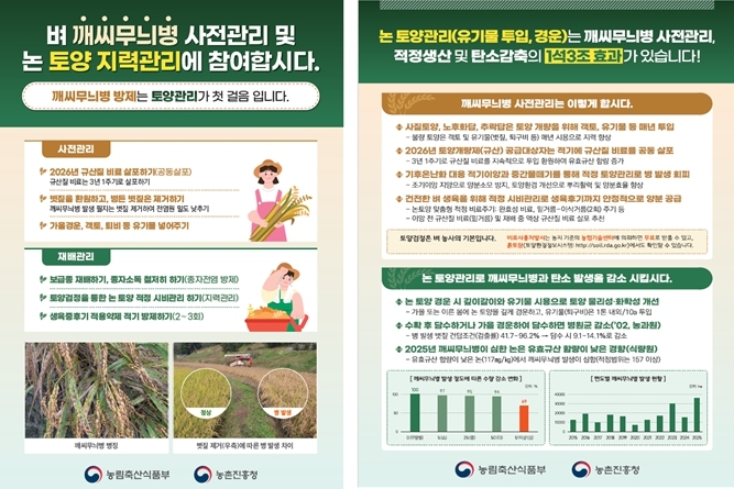 앞서 새해농업인실용교육을 통해 논 토양관리, 병해충 예방 관리 기술을 교육하고, 깨씨무늬병 예방을 위한 사전 관리 요령 안내문을 제작해 전국 시군농업기술센터에 배부했다.