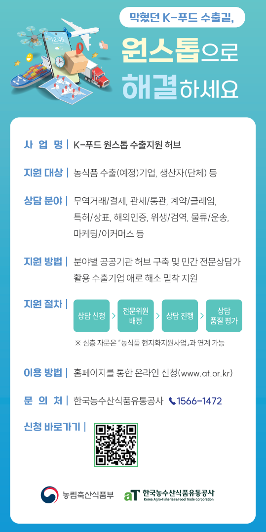 농림축산식품부(장관 송미령, 이하 농식품부)는 지난 12월, 관계부처 합동으로 발표한 「글로벌 K-푸드 수출 확대 전략(A-B-C-D-E)」 내 B전략의 일환으로 관계부처·유관기관의 가용 자원을 효과적으로 활용하여 수출 현장 애로를 신속하게 해결하기 위해 ‘K-푸드 원스톱 수출지원 허브(이하 K-푸드 지원 허브)’를 운영한다고 밝혔다.