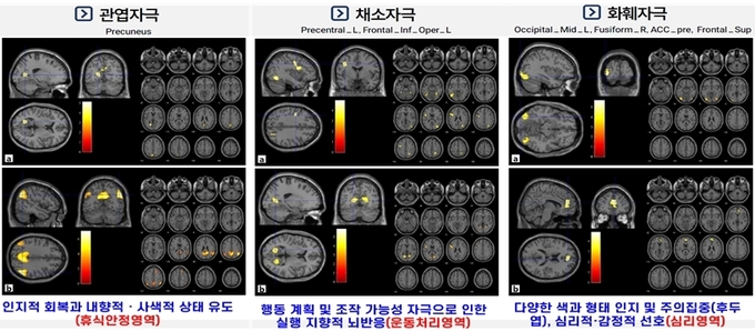 관엽식물을 볼 때는 편안한 상태일 때 나타나는 뇌 활성 반응이 관찰됐다. 관엽식물이 주는 시각적 편안함이 뇌의 기본 휴식 모드(DMN)영역을 활성화해 긴장을 완화했기 때문으로 해석된다.