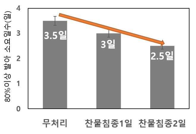 발아 속도가 더딘 볍씨는 온탕 소독 후, 약제 소독 전 15도(℃) 정도 찬물에 1~2일 담가두면 발아 속도가 빨라진다. 단, 물 온도가 높거나 담그는 기간이 길어지면 소독 중 싹이 과도하게 자랄 수 있어 주의한다. 이후 약제 소독은 약제 설명서 온도 및 기간을 준수해 실시한다.