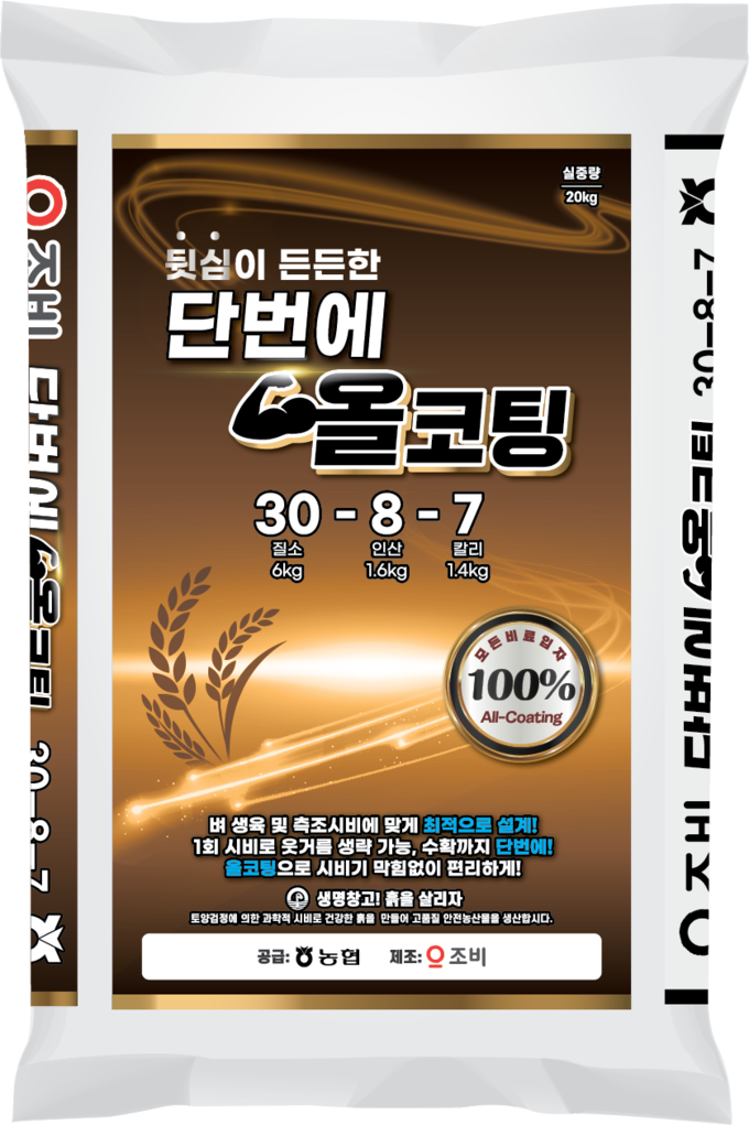 ‘단번에올코팅’은 질소·인산·칼리를 100% 코팅한 벼 전용 완효성 비료다. 벼 생육 단계에 맞춰 양분이 천천히 공급돼 초기 활착과 분얼, 후기 등숙까지 안정적으로 관리할 수 있으며, 도복 경감과 수량 향상에도 도움을 준다. 또한 입자가 균일하고 단단해 축조시비나 기계 살포 시 막힘이 적어 이앙철 작업 효율을 높일 수 있다. ‘단한번S’와 마찬가지로 ‘단번에올코팅S’는 생육기간이 짧은 조생종과 이모작 벼, 저온 지대의 벼 생육 단계에 맞춰 설계되어있어 품종과 재배환경에 따라 유연하게 사용 가능하다.