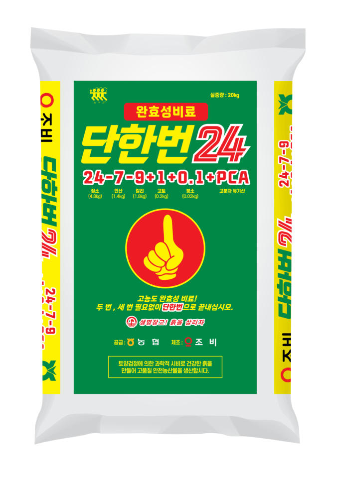 ‘단한번24’는 질소 24, 인산 7, 칼리 9에 고토·붕소와 PCA를 함유한 고질소 완효성 비료다. 최근들어 고질소 비료를 일부 수도 농가에서 사용하기 시작하였는데, 주된 이유는 초기 생육 촉진·분얼증가·잎색 개선을 통해 벼의 몸집을 키우고 수확량을 극대화하기 위해서다. ㈜조비는 이러한 고질소 수도 시장을 위한 완효성 제품으로 ‘단한번24’를 출시하였다. 기존 ‘단한번’의 NPK 성분비에서 질소질 성분이 향상된 제품으로, 제품 ‘단한번’의 효과를 그대로 가져오면서 고질소 시비를 하고 싶은 농가에 추천한다. 기능성 성분인 PCA는 양분 보유력과 이용효율을 높여 비료 효과를 오래 유지하는 데 도움을 준다.
