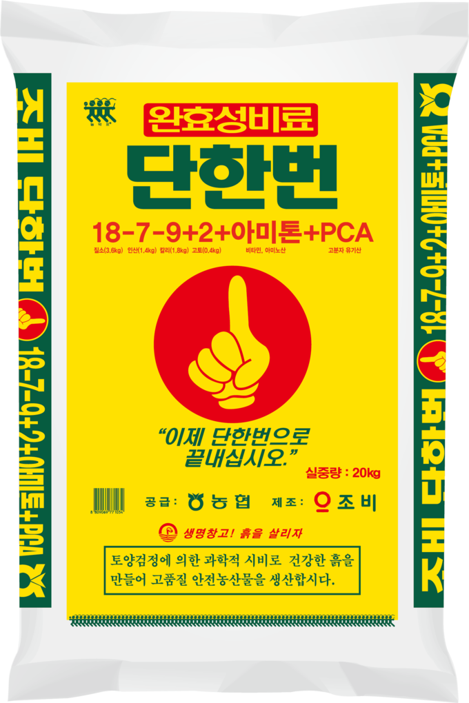 ‘단한번’은 질소, 인산, 칼리뿐 아니라 고토, 아미톤, PCA를 함유한 대표적인 완효성 비료다. 비료 성분이 작물 생육 단계에 맞춰 공급되도록 설계돼 벼에서는 이앙 후 활착과 분얼, 후기 생육 유지에 도움을 주며, 비료 입자가 균일하고 단단해 기계 살포와 측조시비에도 막힘이 적어 작업성이 좋다. 기능성 성분 아미톤은 작물의 종합대사를 활성화하여 생리장해를 줄이고, 양분 흡수효율을 높인다. 특히 단한번S는 생육기간이 짧은 조생종과 이모작 벼, 저온 지대의 생육 단계에 맞춰 설계되어있어 품종과 재배환경에 따라 유연하게 사용 가능하다.