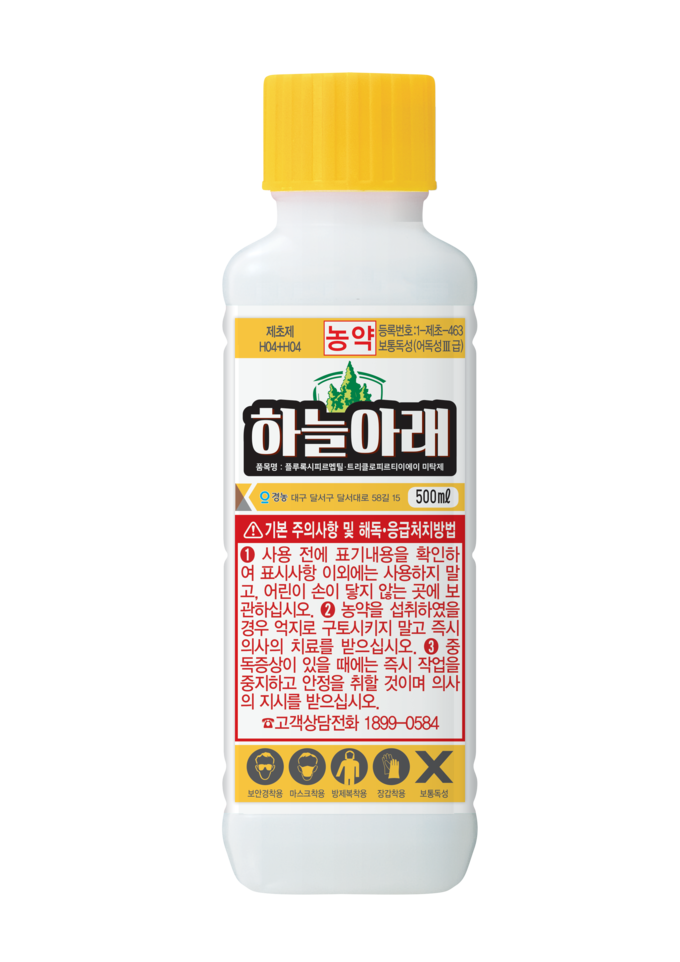 하늘아래는 한국잔디에 등록된 선택성 제초제로, 잔디에는 피해 없이 광엽잡초에만 우수한 효과를 보이는 것이 특징이다. 민들레, 씀바귀, 망초 등 잔디밭에서 많이 발생하는 광엽잡초는 물론 칡, 잡관목, 생태계 교란식물 방제에도 활용 가능하다. 특히 잔디와 띠풀, 대나무, 억새 등 화본과 식물에는 활성이 거의 나타나지 않아 일반 잔디밭은 물론 골프장, 공원, 수목원, 산소, 비농경지 등 다양한 장소에서 사용할 수 있다.