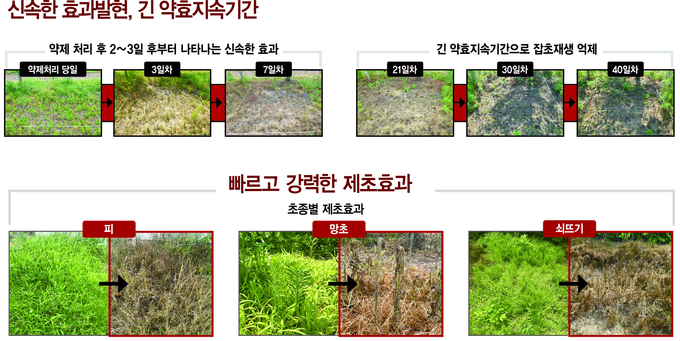 특히 제초 활성물질인 L-Type으로만 구성된 성분으로 빠른 효과 발현과 긴 약효 지속성을 동시에 확보했다. 약제 처리 후 2~3일 내 효과가 나타나며, 30일 이상 잡초 재생 억제 효과 도 우수하다. 특히, 피, 망초, 쇠뜨기 등 다양한 난방제 잡초에 대해 우수한 방제 효과를 보이며, 저온기에도 비교적 안정적인 약효를 나타낸다. 또한 접촉형 제초제로 비산 시 작물로의 이행이 적어 논둑, 과원, 비농경지 등 다양한 환경에서 안전하게 사용 가능하다. 이와 함께 기존 액상 제품 대비 무게와 부피를 약 80% 줄여 보관과 운반 편의성을 크게 개선한 점도 주목된다.