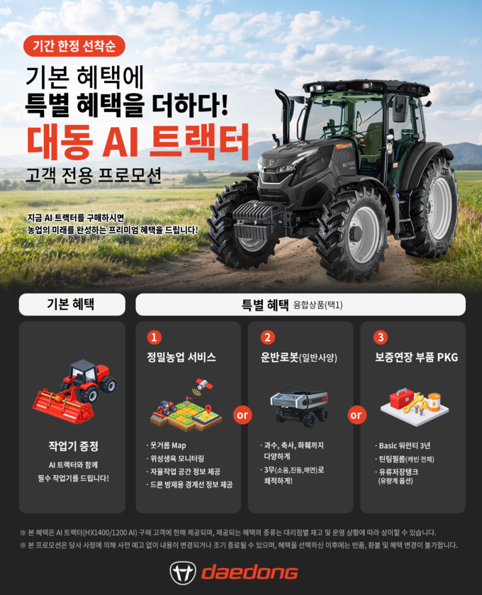 미래농업 리딩 기업 대동(공동대표 김준식, 원유현)은 비전 AI 기반 자율작업 기술을 적용한 AI트랙터의 시장 안착과 고객 경험 확대를 위해 ‘AI트랙터 고객 전용 프로모션’을 진행한다고 20일 밝혔다.