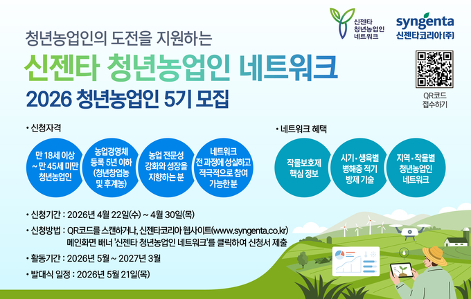 이번 5기 모집은 오는 4월 30일까지 진행되며, 참가 대상은 만 18세 이상 45세 미만의 농업경영체 등록 5년 이하의 청년 창업농 및 후계농업인이다. 참가를 희망하는 농업인은 신젠타코리아 홈페이지를 통해 신청할 수 있다.
