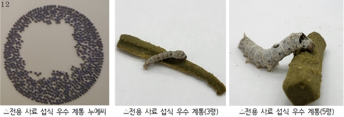 ▶전용 사료 맞춤 누에 품종=자동화 장치와 전용 사료 효과를 높이기 위해 전용 사료 섭식이 우수한 맞춤 품종이 필요하다.