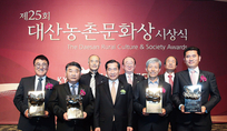 대산농촌재단(이사장 오교철)은 지난 10월 26일 제25회 대산농촌문화상 시상식을 개최했다. 시상식에서는 농업기술 부문 김중호 씨(39대호(주) 대표), 농업경영부문 손우기 씨(64, 신선미세상(주) 대표) 농촌발전 부문 김준권 씨(68, 평화나무농장 대표), 농업공직 부문 여수환 씨(52농촌진흥청 국립농업과학원 농업연구사) 등 4개 부문 4인의 수상자에게 각각 5000만원(농업공직 부문 1000만원)을 수여했다. 대산농촌문화상은 교보생명 창립자 대산 신용호 선생의 뜻으로 1991년 제정되었다. 농업과 농촌의 가치를 드높이고, 지속 가능한 사회 발전에 크게 이바지한 인사에게 수여하는 농업계 최고 권위의 상이다. 농업기술 부문 김중호 대표(39)는 오리발 써레, 두골 복토기 등 농민에게 유용한 농기계를 지속적으로 개발해왔다. 특히 트랙터, 굴착기, 지게차, 스키드로더 등 다목적 복합 작업 기능을 지닌 획기적인 농기계 ‘로보랙터’를 개발, 보급해 한국 농기계 산업 발전과 농민 삶의 질 향상에 이바지한 공로를 인정받았다. 농업경영 부문 손우기 대표(64)는 농민과 상생하는 농산물 유통 시스템을 확립하고, 이를 토대로 경기도 학교 급식에 친환경 농산물을 안정적으
